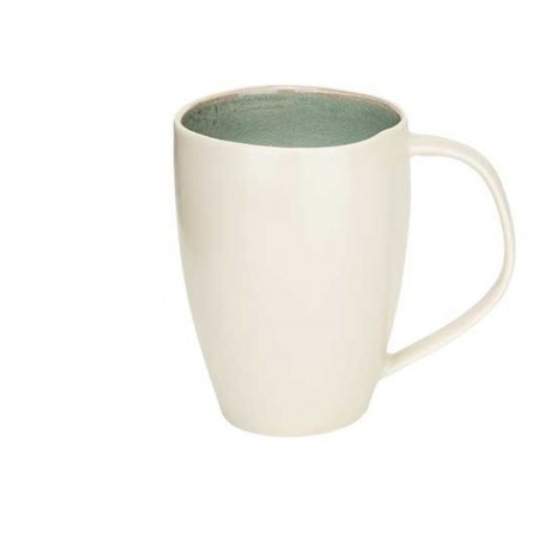 Koffiebeker uit de serie Jacinto Green met een crèmekleurige buitenkant en een groene binnenkant. De beker heeft een prachtige vorm en is van aardewerk met een matte buitenkant en een glanzende binnenkant.