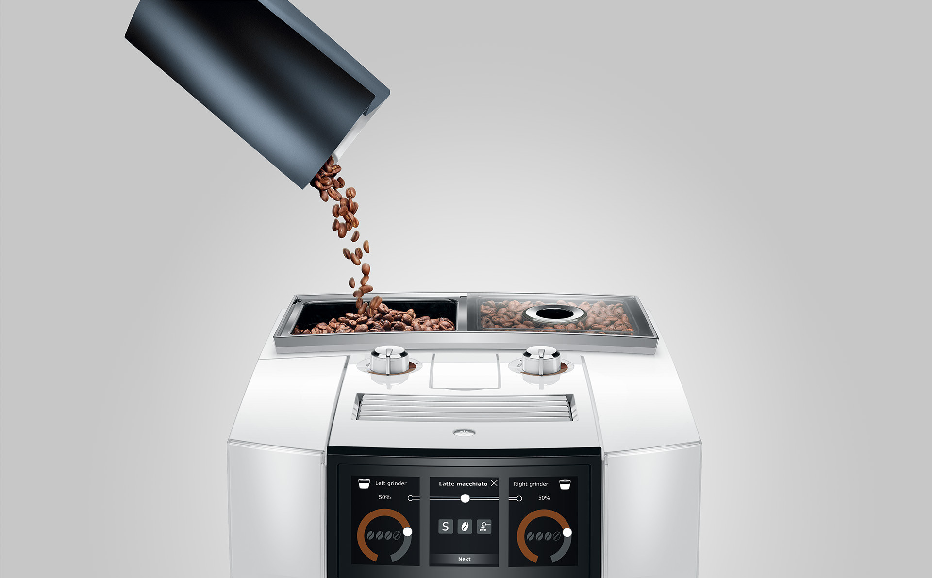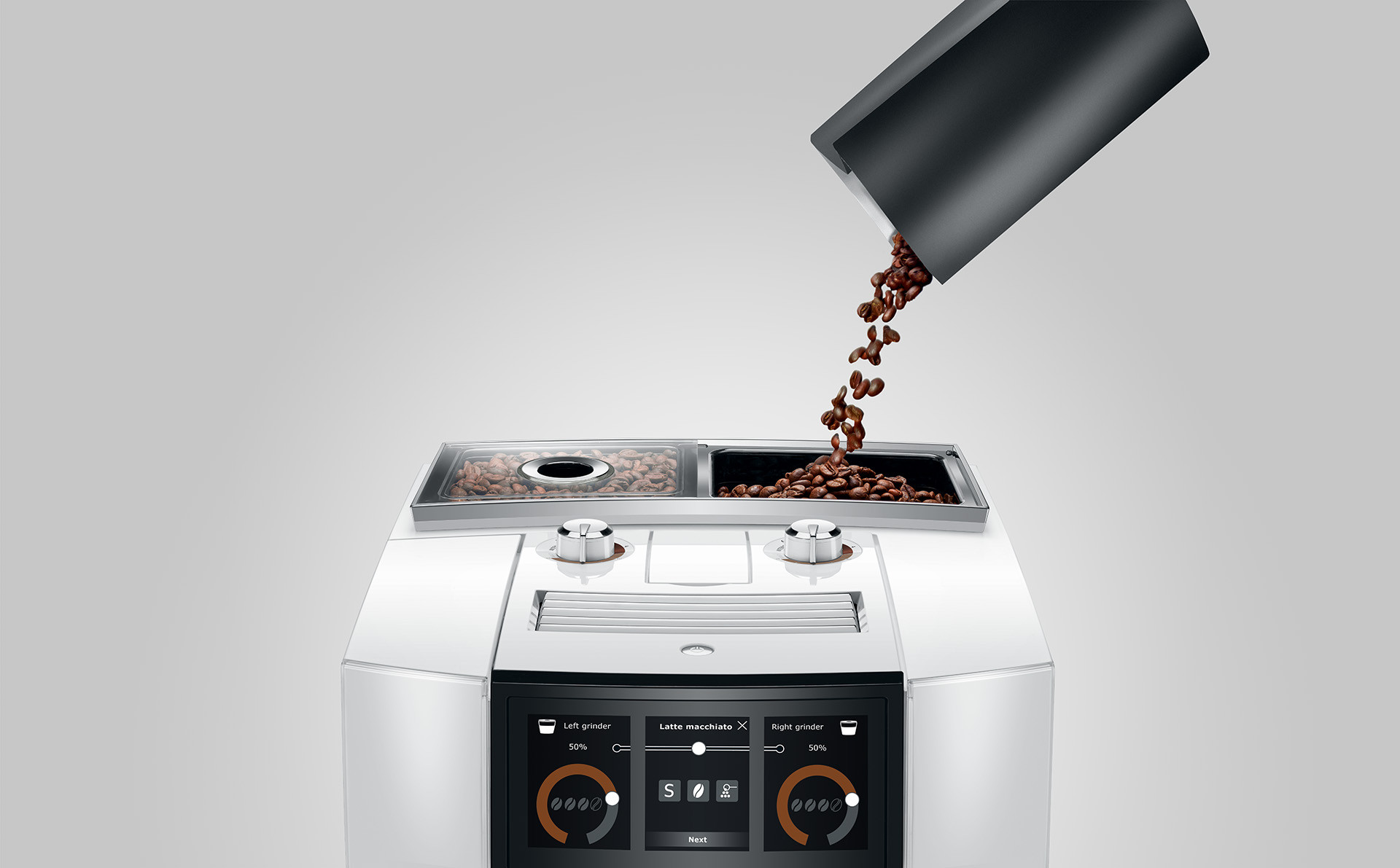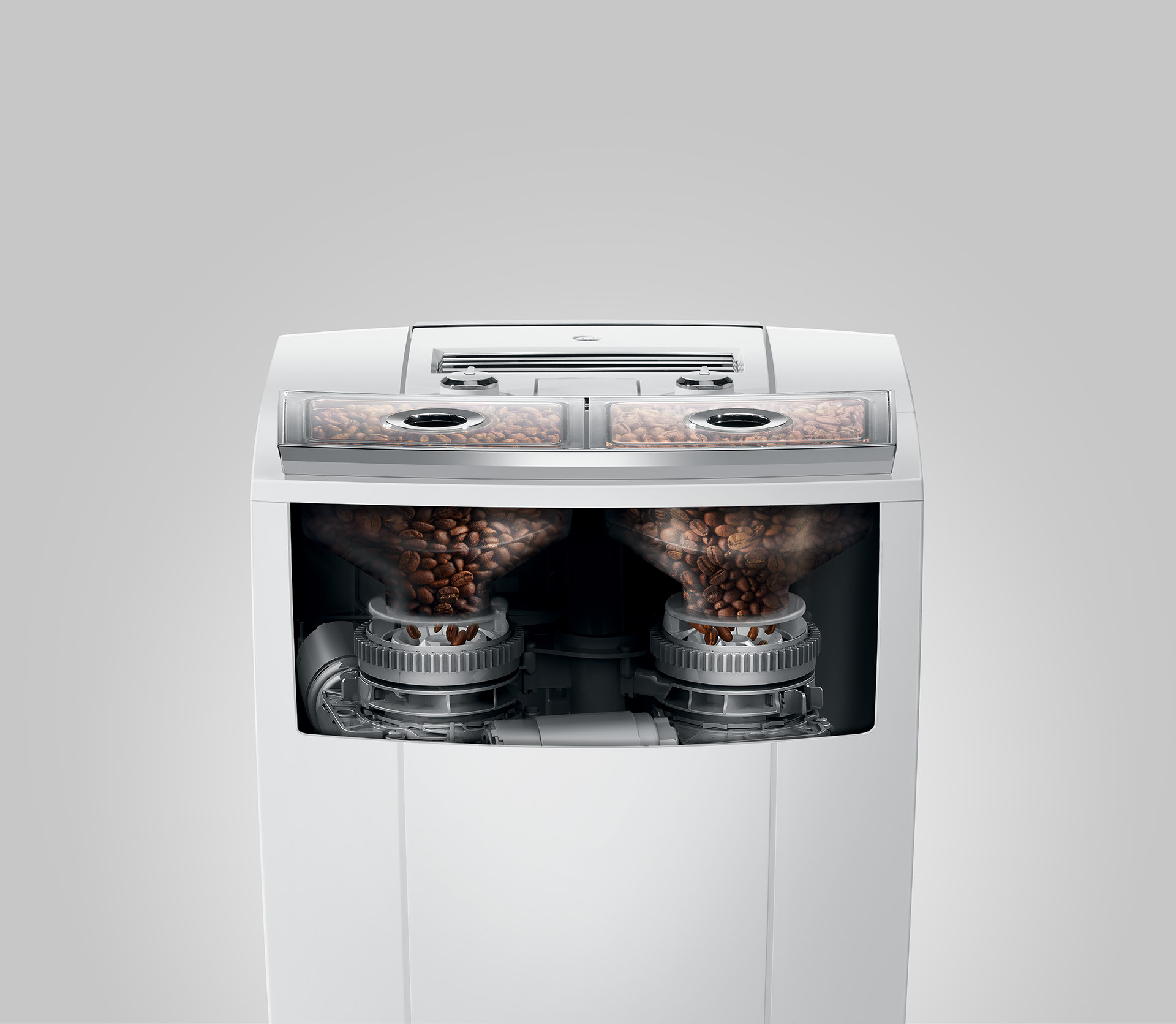 Wat maakt de JURA J8 Twin uniek? De JURA J8 Twin beschikt over twee onafhankelijke molens die het mogelijk maken om met één machine twee verschillende koffiesoorten te malen en te brouwen, ideaal voor zowel cafeïne als cafeïnevrije opties.
