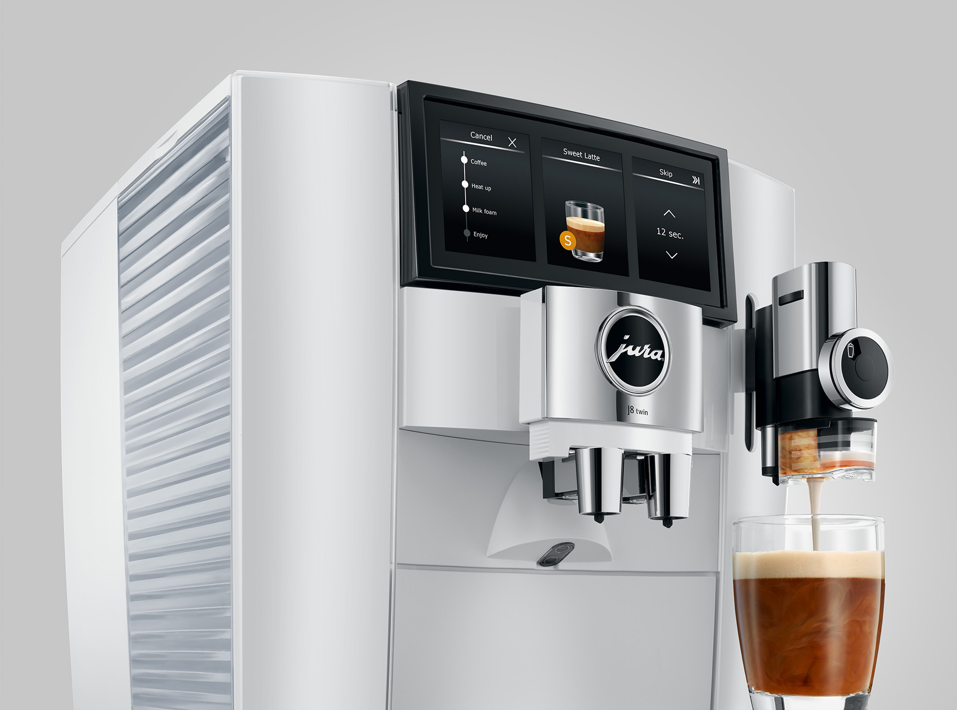 Ontdek de veelzijdigheid van koffie met de JURA J8 Twin - uw persoonlijke dubbele barista. Deze geavanceerde volautomaat verheft uw koffie-ervaring met twee geïntegreerde precisiemolens, waardoor u de vrijheid krijgt om met één druk op de knop te kiezen tussen een volle cafeïne kick of een zachte cafeïnevrije blend. De JURA J8 Twin vertegenwoordigt de samensmelting van twee volautomatische machines in één gestroomlijnde, krachtige eenheid, die u de keuze biedt uit niet één, maar twee koffiesoorten.