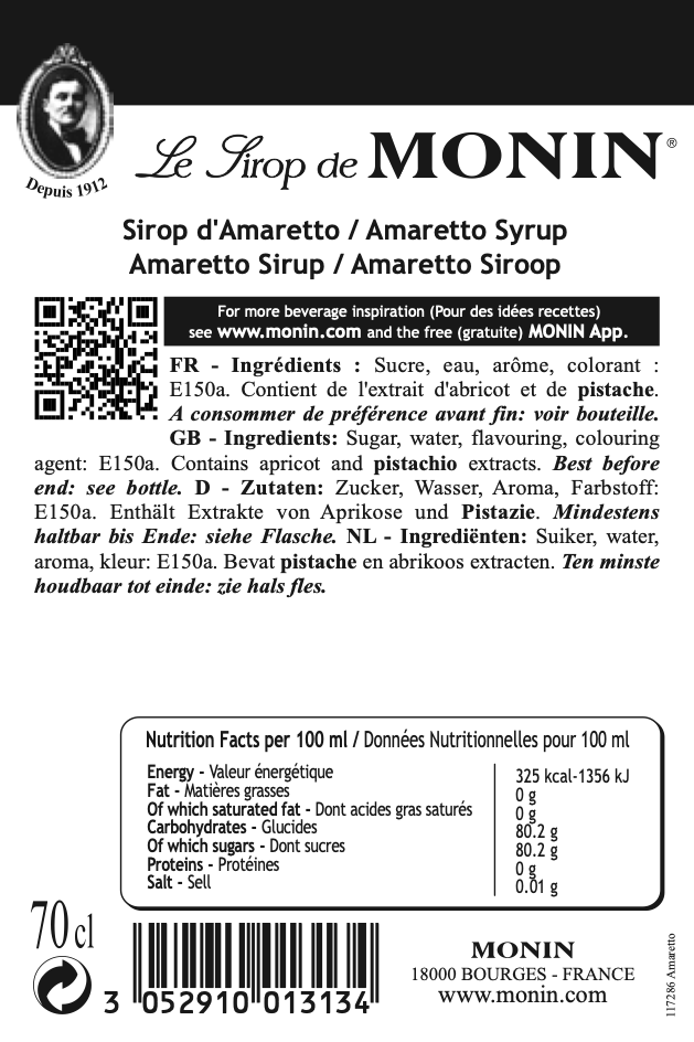 Monin Amaretto heeft de bitterzoete smaak van de populaire likeur en kan gebruikt worden om heerlijke Tiramisu cappuccino en vele andere verleidelijke Italiaanse nagerechten en after-dinner drankjes te maken.