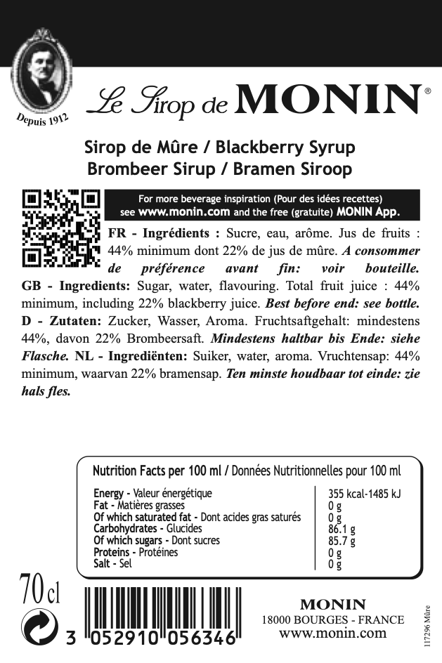 Monin Bramen siroop geeft een zoetzure, rijpe bramensmaak aan al uw chocoladedranken, koffie, frisdrank en cocktails. Ook is het erg geschikt om de populaire Bramble cocktail mee te maken.