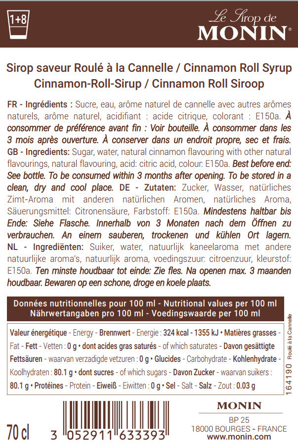 Klaar om je drankjes en desserts naar een hoger niveau te tillen? Met Monin Cinnamon Roll Siroop tover je in een handomdraai de warme, troostende smaak van versgebakken kaneelbroodjes tevoorschijn. Of je nu een professionele barista bent of gewoon van lekker genieten houdt, deze siroop is jouw geheime ingrediënt voor culinair succes.
