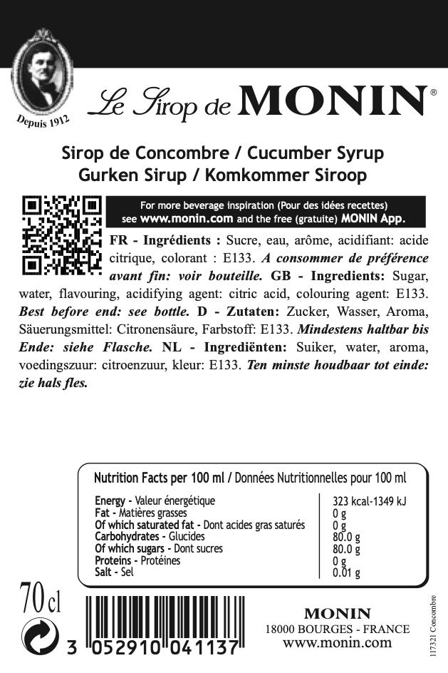 De Monin Komkommer siroop geeft u een verfrissend, verkoelend en gezond gevoel. Komkommers worden in vele landen verkocht, maar komkommersap is delicaat en heeft een korte houdbaarheidsdatum. Monin Komkommer siroop bespaart professionals tijd zonder de verfrissende smaak van komkommer te verliezen. Ook is dit door de toenemende groentesmaken in cocktails ook een erg geschikt ingrediënt voor bartenders.