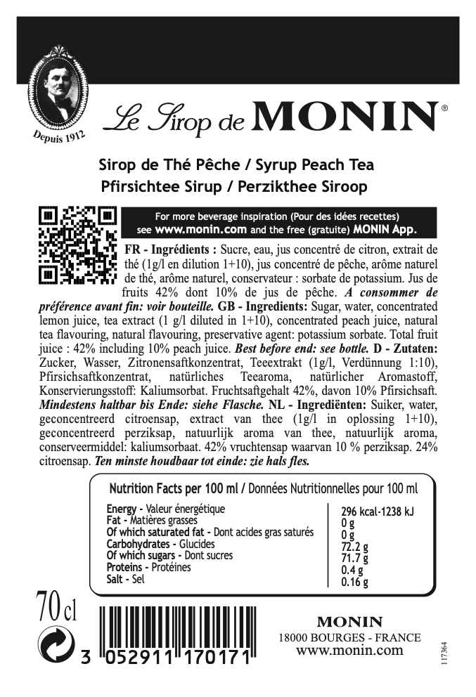 Het nieuwe MONIN-assortiment theesiroop maakt verbazingwekkende creaties van ijsthee mogelijk met een echte doordrenkt theesmaak. Ze kunnen opgediend worden, op ijs -met frisdrank of nog steeds water- of gearomatiseerd. Maatwerk kan worden gedaan met MONIN fruit, specerij of kruidensiropen. De theesmaak wordt vooral versterkt door het rijpe fruit en de combinatie met Le Fruit de MONIN is ongelooflijk.