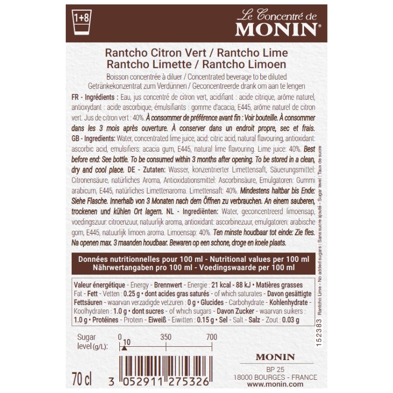 De limoen is, net als de citroen, vooral bekend om zijn verfrissende en zure smaak. De werkelijke oorsprong is niet bekend, maar er wordt gedacht dat de limoen uit India komt. Limoensap is erg rijk aan vitamine C en heeft veel culinaire toepassingen. Monin Limoen Rantcho is een suikervrij concentraat zonder vruchtvlees en bestaat voor 50% uit het citroensap van de beste Siciliaanse citroenen. Het wordt door barmannen geprezen voor zijn echte smaak en geschikte vervanger voor limoensap.