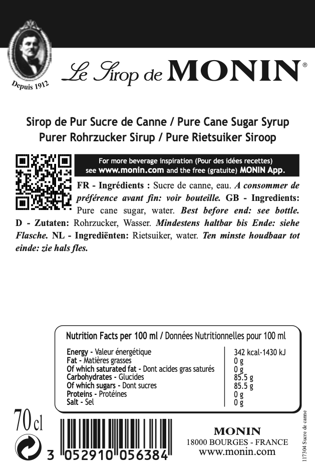 Monin Rietsuiker siroop is de basissiroop van vele cocktails en is gemaakt van 100% puur rietsuiker en gefilterd water. Suikerriet is een lange plant die het hele jaar te vinden is, kan meters lang worden en komt oorspronkelijk uit de tropische regio's van Zuid-Azië. Hier wordt vandaag de dag nog steeds 80% van al het suiker geproduceerd.
