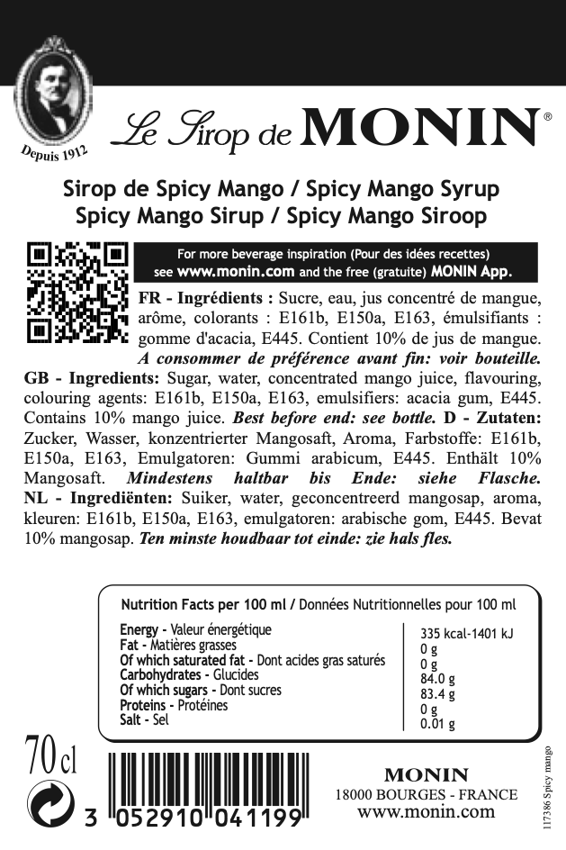 De zoete, sappige mango is een van de populairste fruitsoorten in tropische landen over de hele wereld. Mango's zijn heerlijk simpelweg geschild of in salades of chutneys. Het geel-oranje vruchtvlees is sappig, kenmerkend van smaak en zoet. Monin Spicy Mango siroop mixt de smaak van mango met pittige Serrano peper. Het is een erg gebalanseerde en veelzijdige smaak om achter de bar te gebruiken. Gebruik Monin Spicy Mango siroop in cocktails en non-alcoholische drankjes voor een verfrissende en pittige creatie!