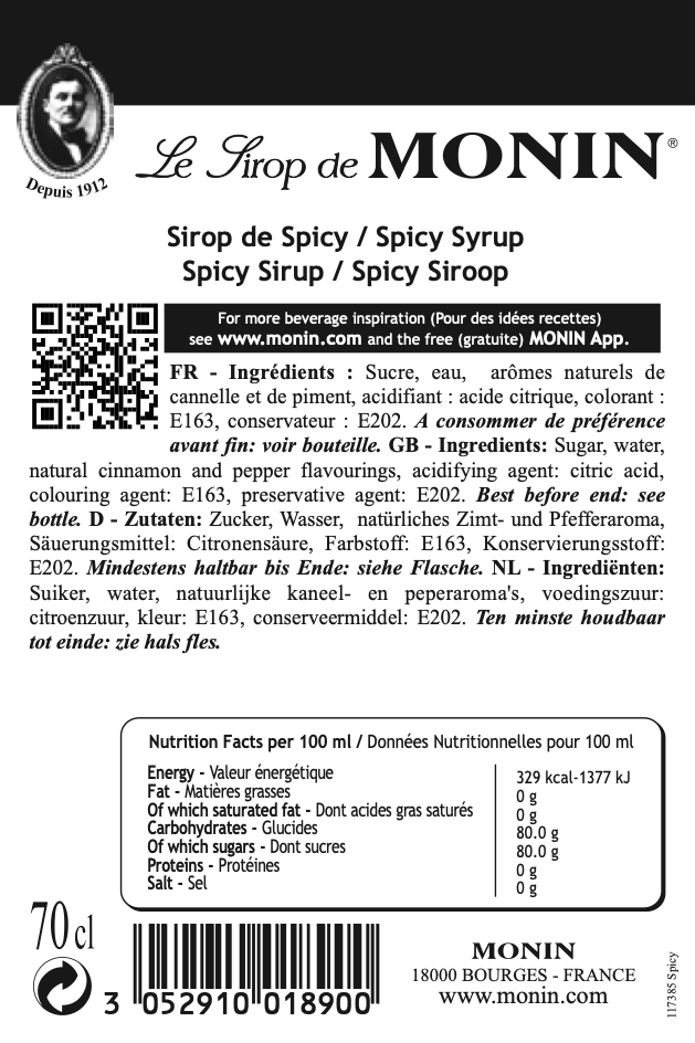 Deze smaak is gemaakt op verzoek van Olivier Monin voor Halloween. Monin Spicy siroop zal vuur in uw drankjes brengen met z'n pikante smaak van natuurlijke extracten van chilipepers en kaneel.