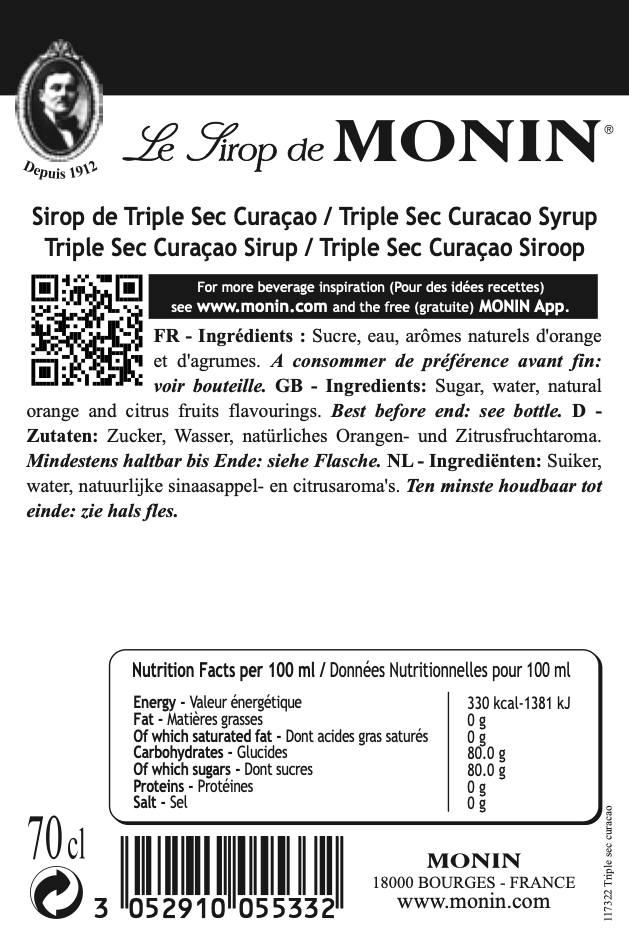 Triple Sec Curacao siroop is de non-alcoholische versie van de bittersweet sinaasappel likeur. De likeur is gemaakt van gedroogde schillen van bittere en zoete sinaasappels. Oorspronkelijk werd het gemaakt in het midden van de negentiende eeuw in Frankrijk.