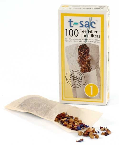 Handige theefilterzakjes voor gebruik in combinatie met losse thee. U vult het zakje met de gewenste hoeveeheid losse thee en hangt het zakje in de theepot, waarbij u het bovengedeelte van het filterzakje uit de pot laat, het deksel sluit en het zakje vastklemt. U kunt nadat de thee getrokken is gemakkelijk het zakje weer verwijderen via het gedeelte dat buiten de pot is gebleven. Een doosje T-sac bevat 100 filters. Verkrijgbaar in maten 1, 2 en 3.